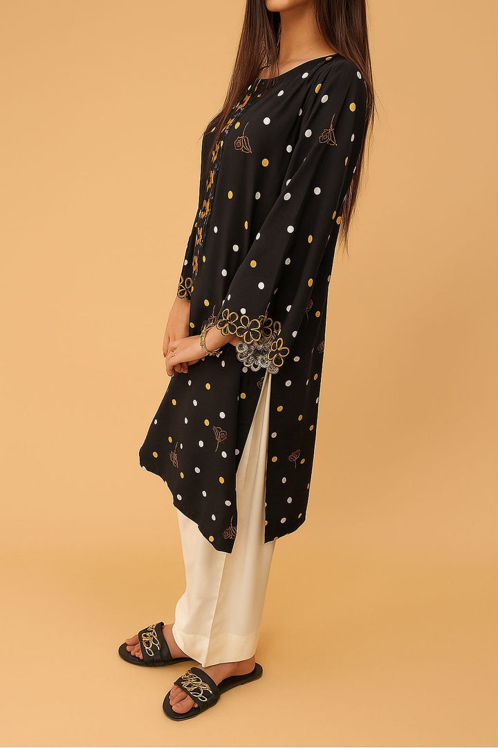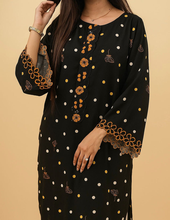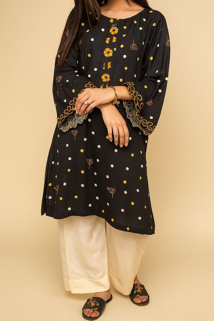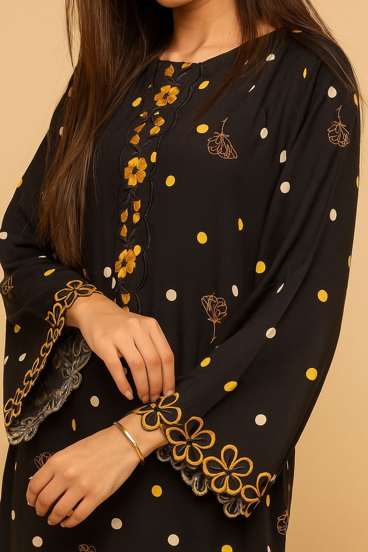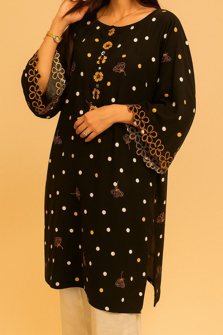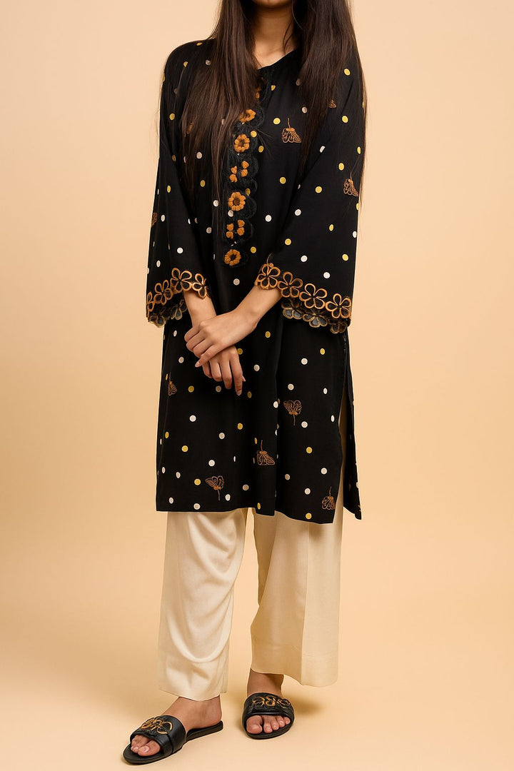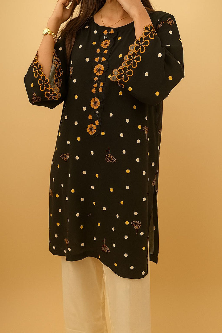 A chic long shirt adorned with playful polka dots and delicate floral embroidery, finished with scalloped borders for a feminine touch. Paired with soft cream trousers, this 2-piece outfit offers both elegance and ease an effortless choice for everyday sophistication.