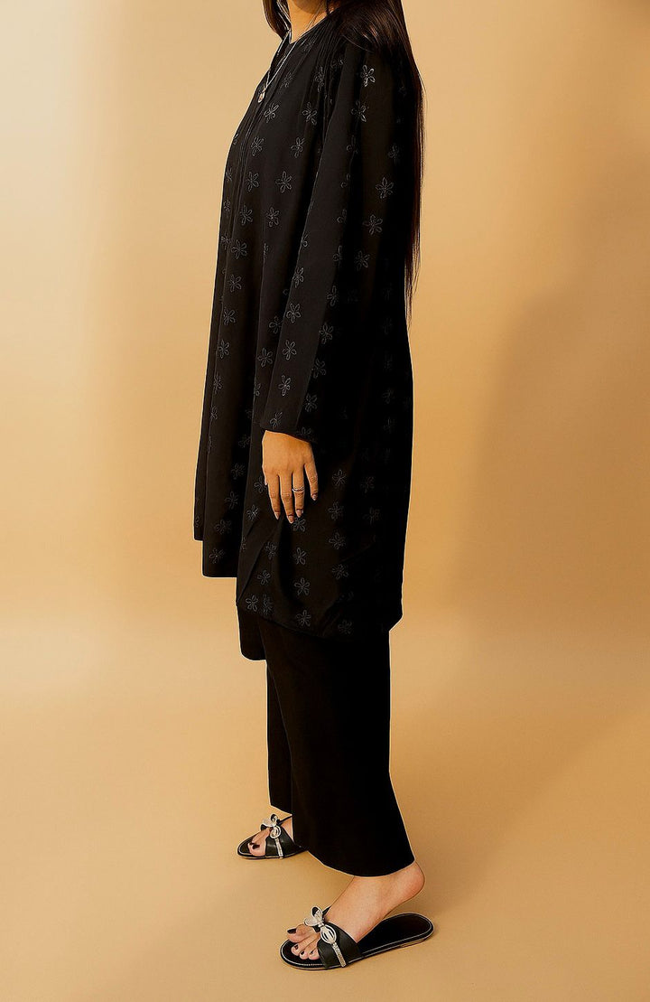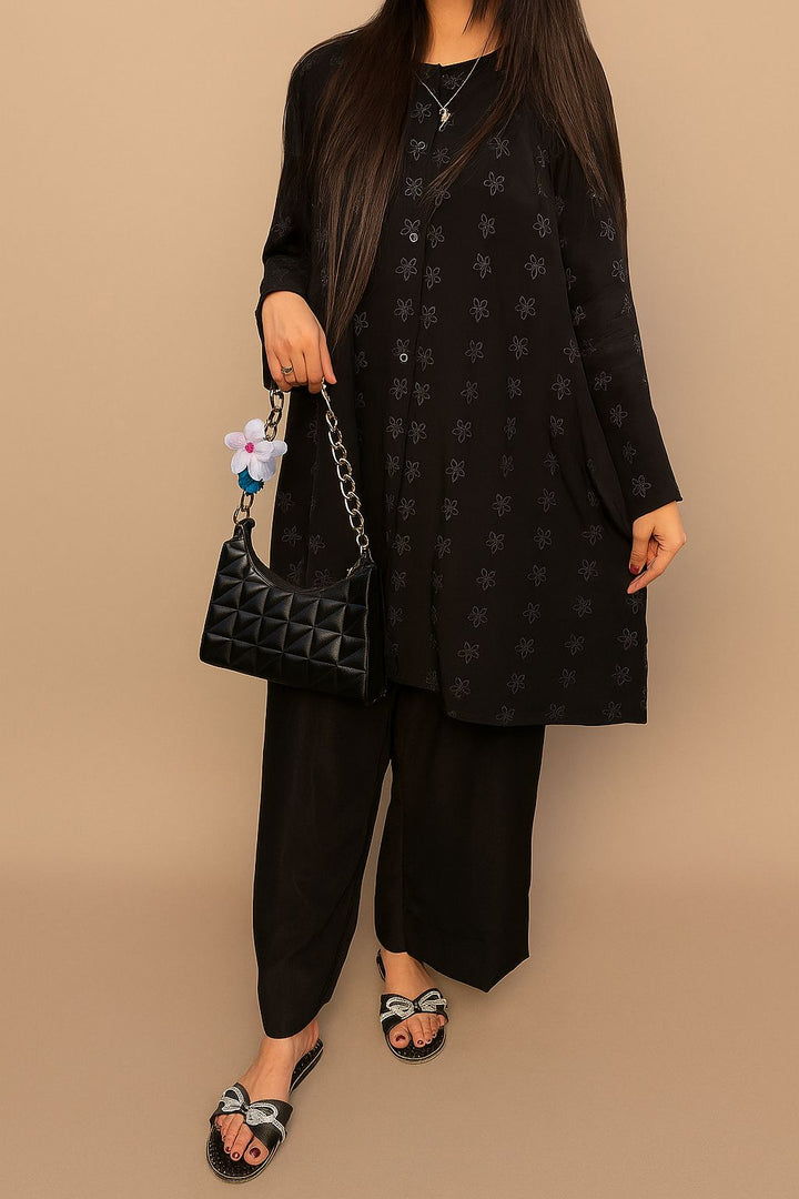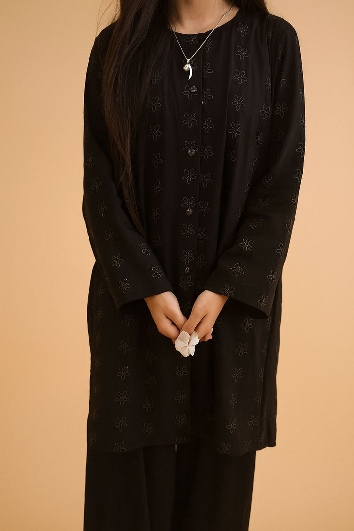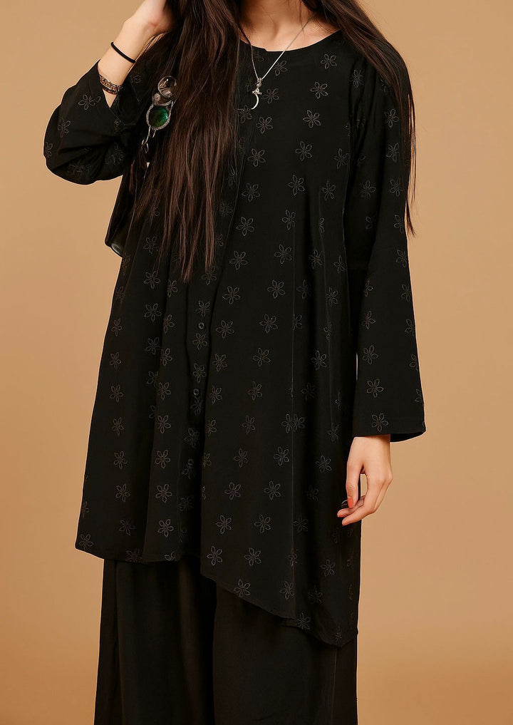 A sleek black 2-piece co-ord set crafted from luxurious silk chikankari. The long flowy shirt with a relaxed silhouette is paired with matching wide-leg trousers, creating a refined yet comfortable look for everyday elegance.