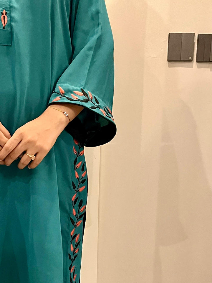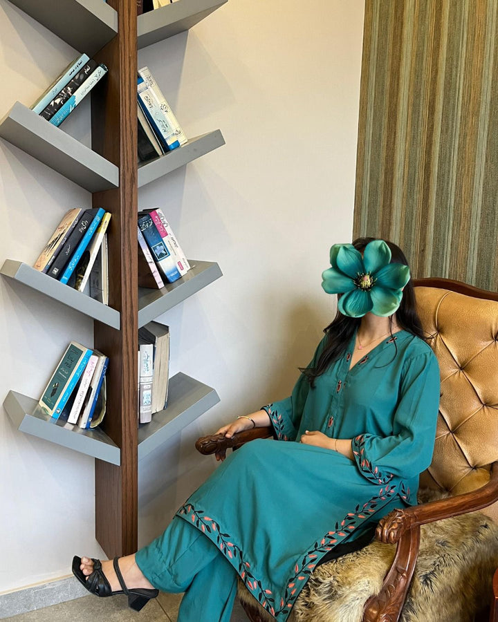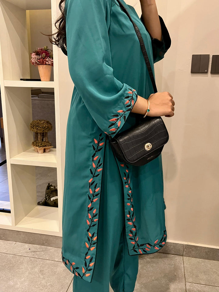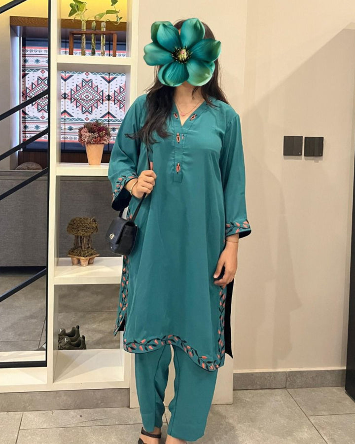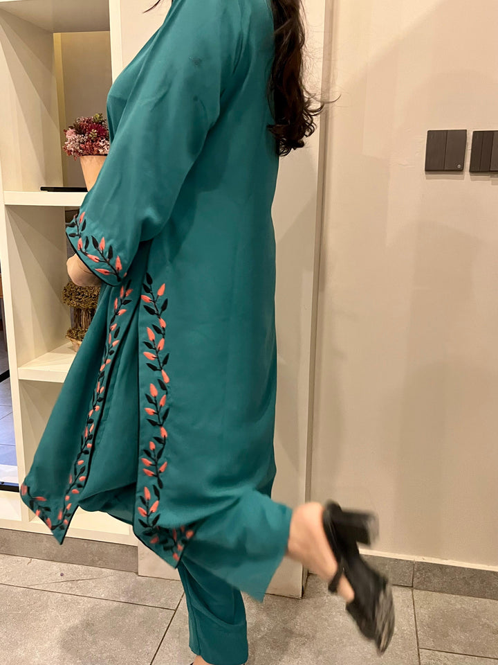 A rich teal 2-piece set in lightweight georgette, adorned with delicate embroidery in coral and black along the neckline, sleeves, and borders. Paired with matching trousers, it offers a graceful drape with all-day comfort. Elegant yet versatile, it transitions seamlessly from casual outings to semi-formal gatherings.